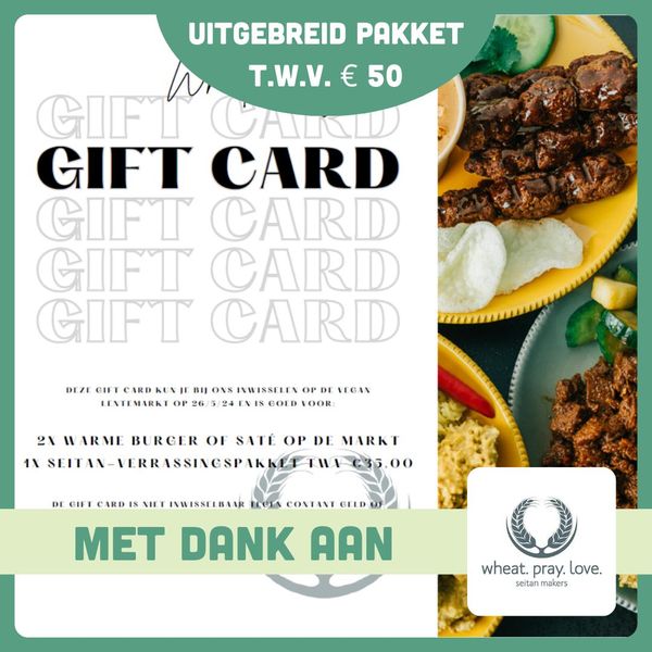 Wheat.Pray.Love verwent je graag met een uitgebreid seitanpakket. Deze cadeaubon kun je op de Vegan Lentemarkt inwisselen voor een seitanpakket t.w.v. €35 (voor in de diepvries) en twee warme broodjes of satétjes.