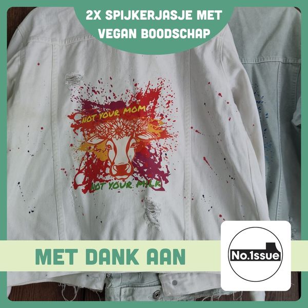 No.1ssue maakt duurzame kleding met een vegan boodschap. Voor deze loterij hebben ze een flink aantal kledingstukken gedoneerd in verschillende maten. De eerste hiervan is dit prachtige spijkerjasje met een krachtige boodschap (2 stuks).