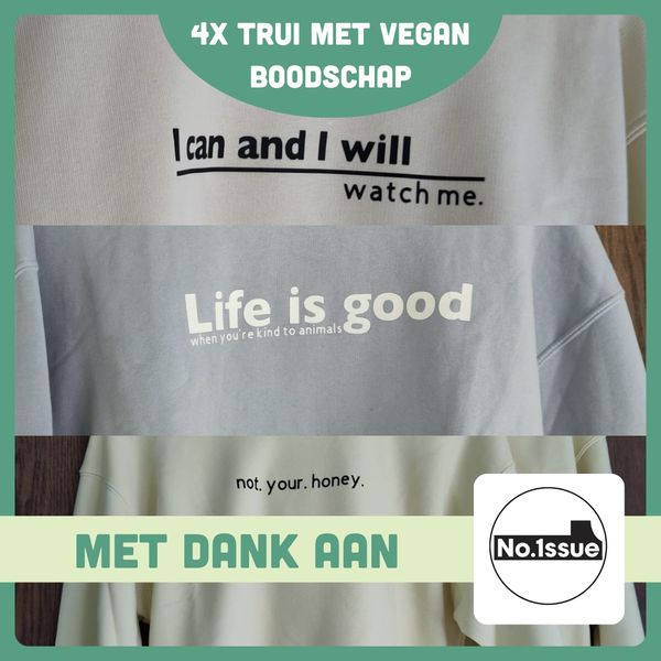 No.1ssue maakt duurzame kleding met een vegan boodschap. Voor deze loterij hebben ze een flink aantal kledingstukken gedoneerd in verschillende maten, waaronder deze 4 truien met een krachtige boodschap.