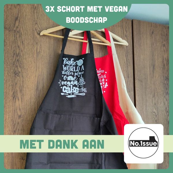 No.1ssue maakt duurzame kleding met een vegan boodschap. Voor deze loterij hebben ze een flink aantal kledingstukken gedoneerd in verschillende maten. Deel 3 bestaat uit deze 3 schorten met vegan boodschap.