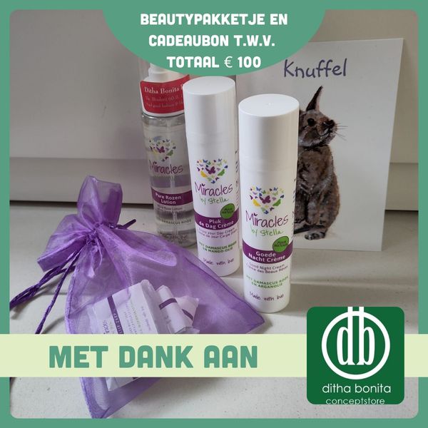 Ditha Bonita ziet de wereld graag fun, fair en vegan. Daarom doneert ze een beautypakket t.w.v. € 75, met daarbij ook nog eens een cadeaubon van € 25 zodat je zelf ook nog wat uit kunt zoeken.